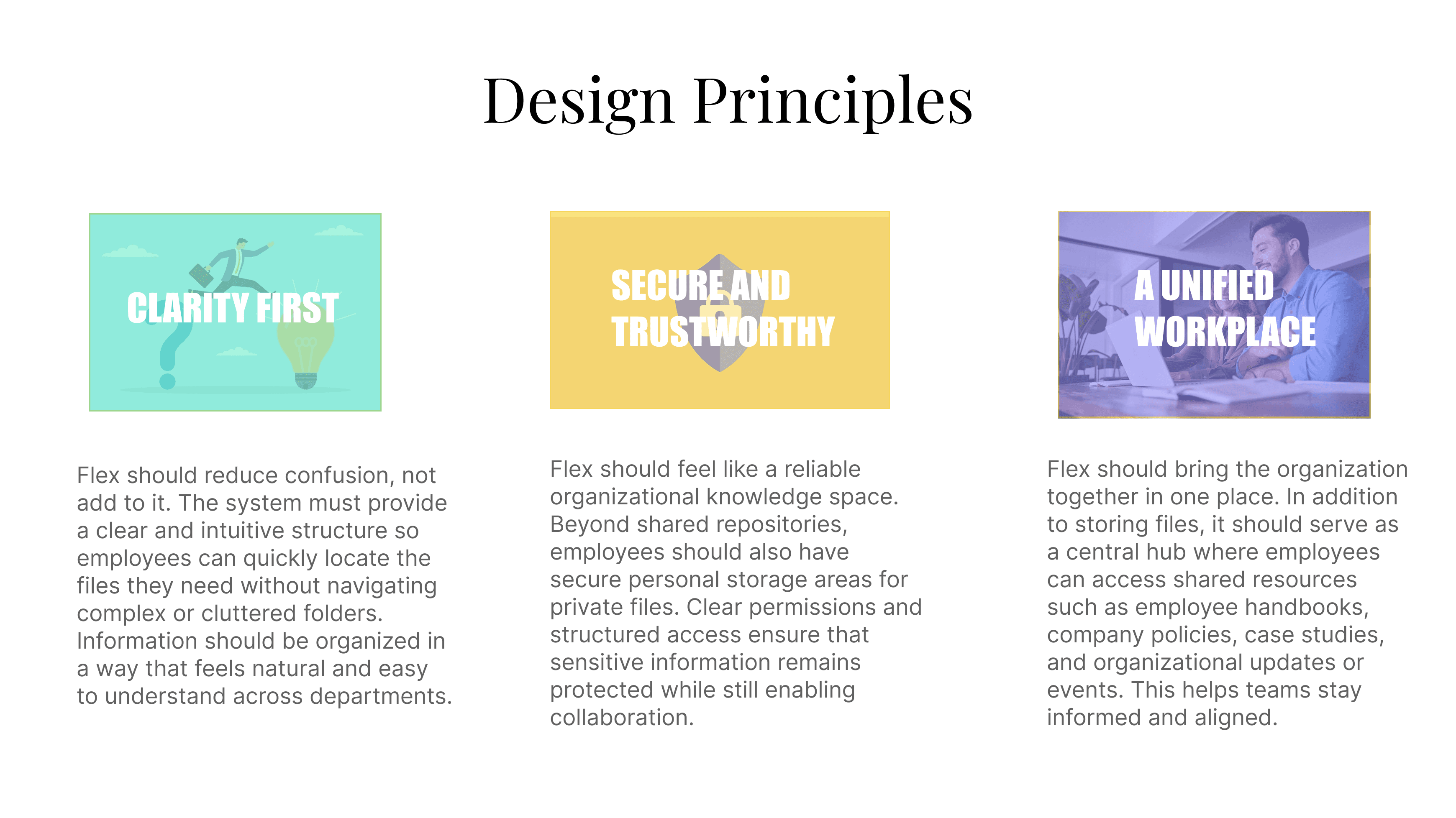 Based on insights gathered from multiple interviews with stakeholders, team leads, and employees across departments, it became clear that the repository needed to go beyond simply storing files. Different teams had varying workflows, concerns around accessibility and security, and a shared need for clarity in how information is organized. These conversations helped identify the core needs that Flex had to address, leading to the following design principles that guided the structure and experience of the platform.