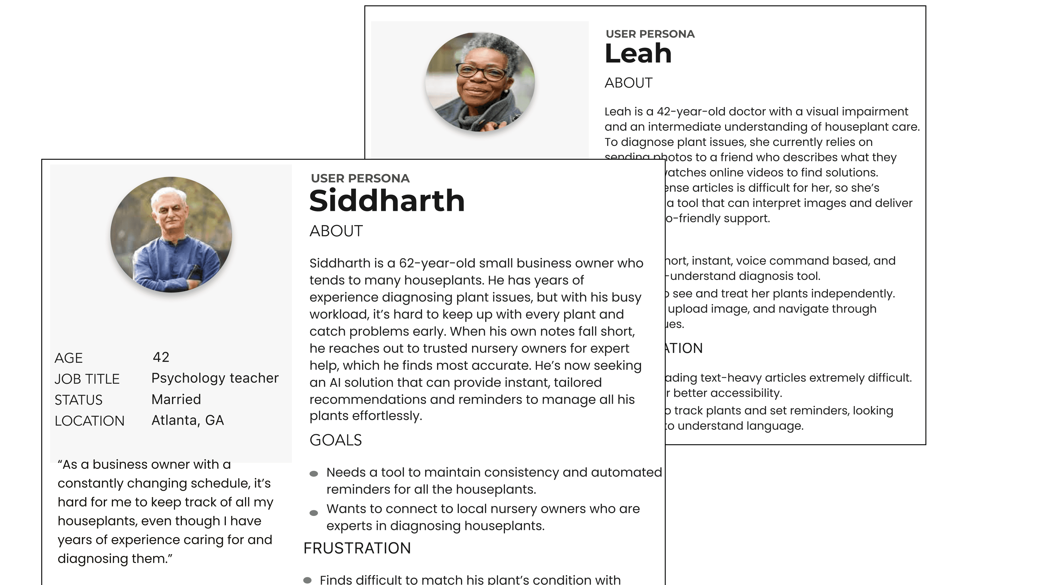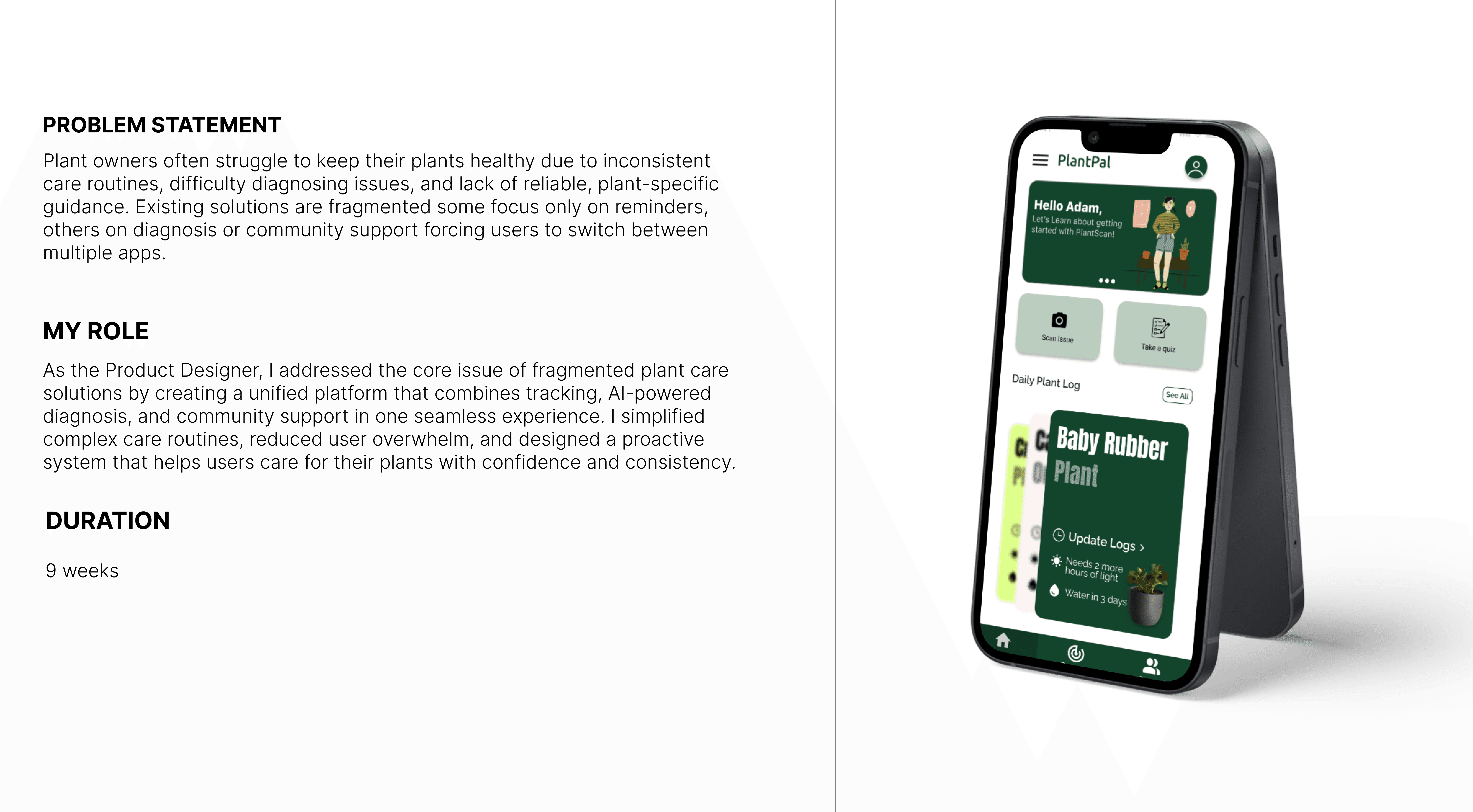 To understand user needs, I conducted interviews with both beginner and experienced plant owners to uncover gaps in their care routines. The research revealed recurring pain points, including difficulty accurately diagnosing plant issues and the lack of structured follow-up tracking after initial identification. A competitive analysis further showed that most existing apps focus primarily on plant identification rather than supporting the full care lifecycle, leaving users without ongoing guidance or proactive support.