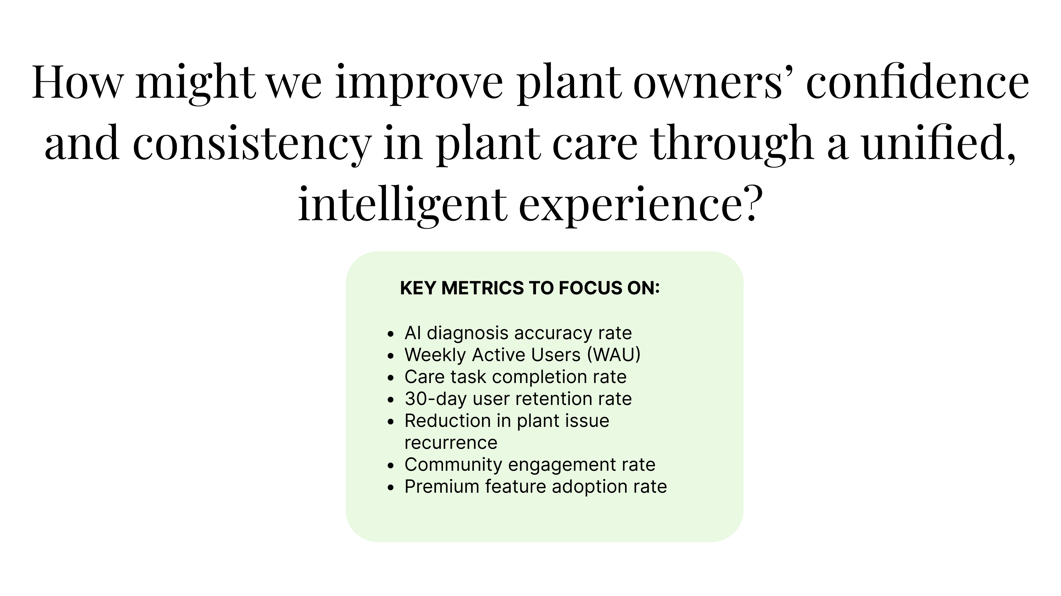 In the Define stage, I translated research insights into a clear problem statements, user personas, aligned user and business goals, and identified key metrics to guide PlantPal’s product direction.